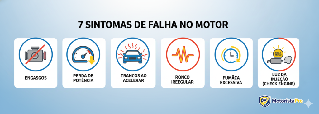 Falha no motor é qualquer irregularidade no funcionamento que você percebe dirigindo. Os sintomas mais comuns incluem: