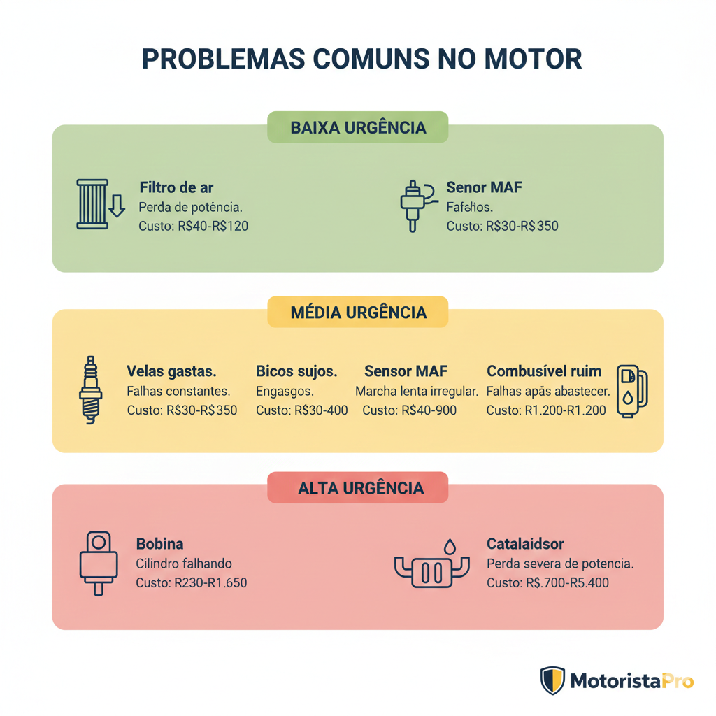 🔴 Alto: Rodar com cilindro falhando danifica o catalisador (reparo de R$ 2 mil a R$ 5 mil). Resolva em até 3 dias.